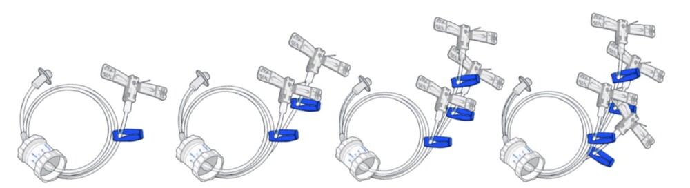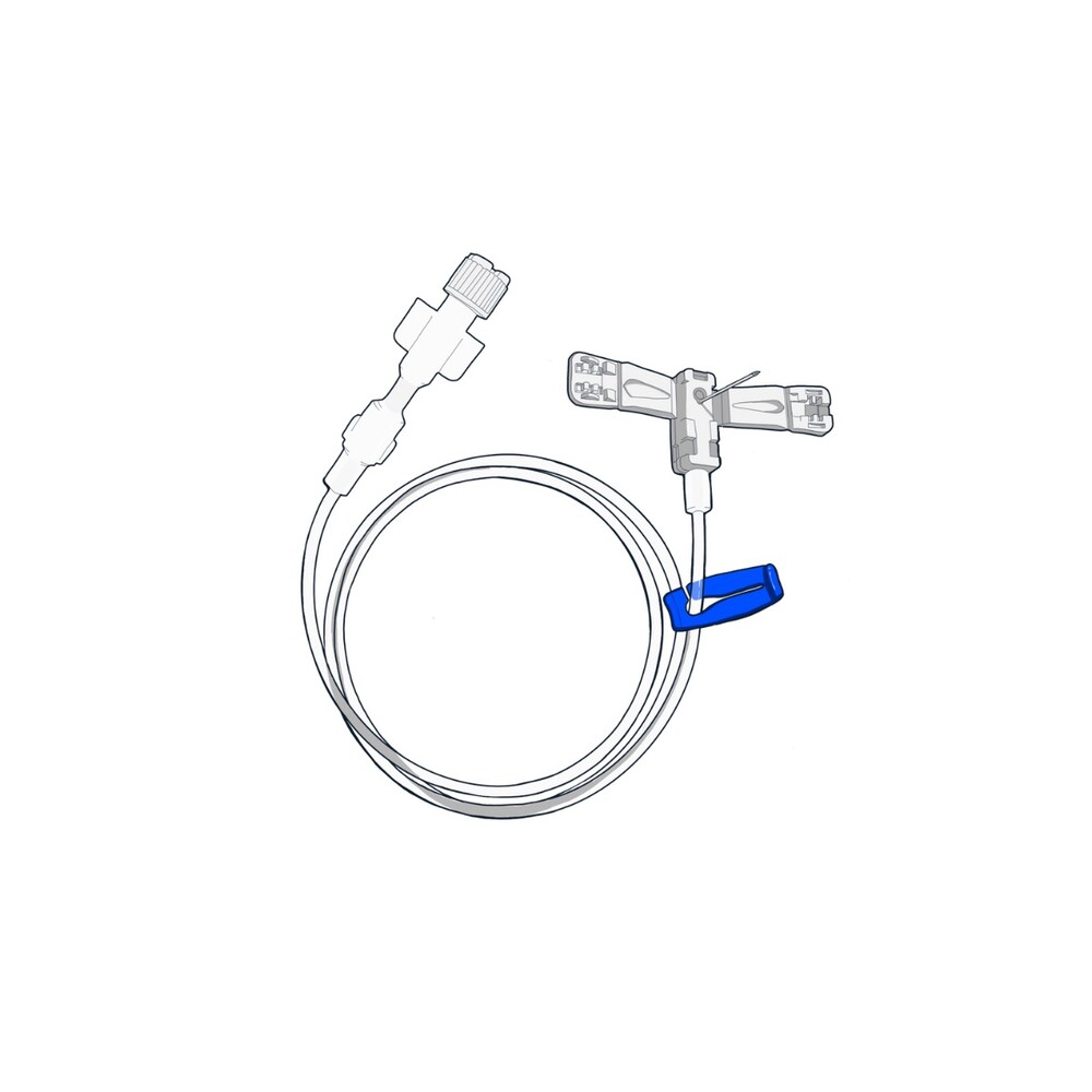 - Custom female luer connector, designed to provide equal flow to each needle site.